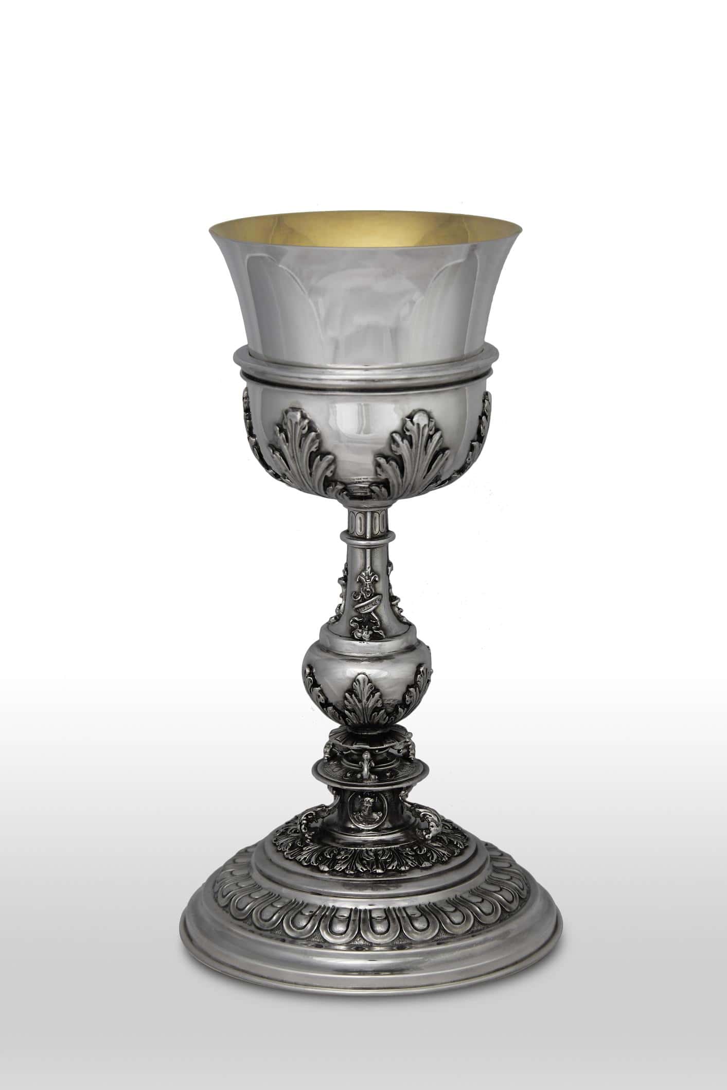 Cáliz en plata de ley . La copa es amplia y ligeramente acampanada, cuyo interior tiene un baño de oro. Su superficie es lisa, pero justo en la base de la copa aparecen relieves decorativos con hoja de acanto.