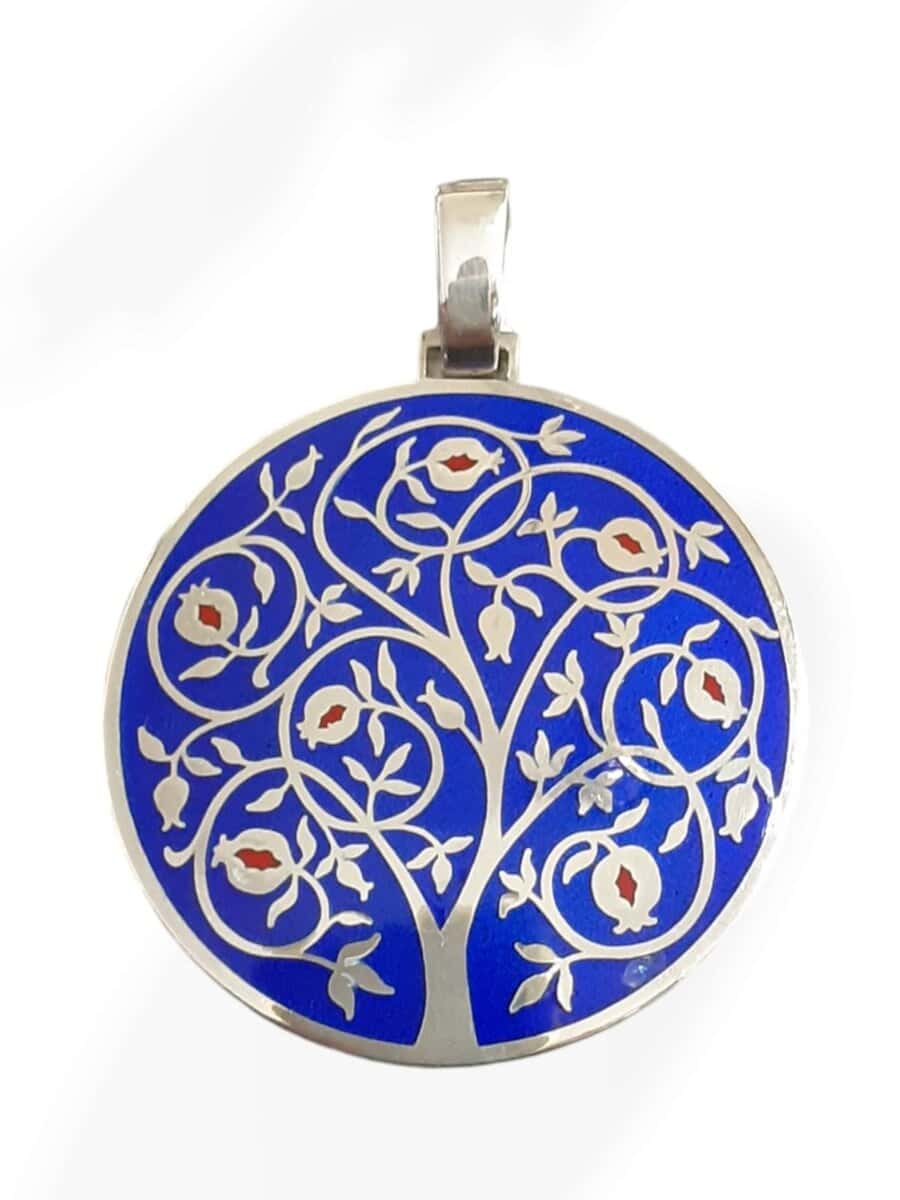 Este colgante muestra un diseño circular de esmalte azul intenso con un árbol de granado estilizado en plata. Las ramas forman un dibujo delicado y simétrico, lleno de hojas finas y frutos de granada destacados con pequeños toques de esmalte rojo, que aportan contraste y detalle.