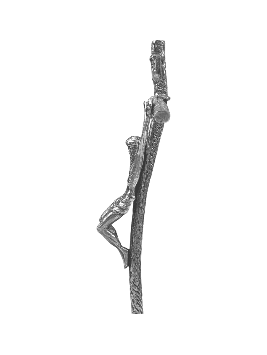Cruz Peregrina en plata de ley, realizada artesanalmente con textura que imita la madera. Representa a Cristo crucificado en una figura estilizada y detallada, coronada por la cartela “INRI”. Inspirada en la cruz pastoral llevada por el Papa Juan Pablo II, es un símbolo de fe y peregrinación, trabajado con la maestría de la orfebrería tradicional.