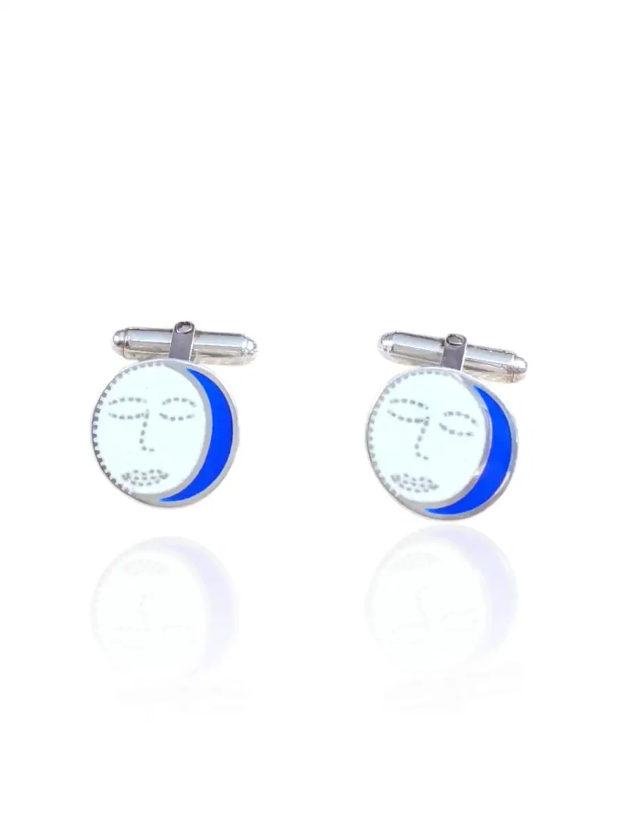 Gemelos con la Luna” inspirados en el poema de Federico García Lorca son una pieza de joyería artesanal elegante y poética. Están fabricados en plata de ley, lo que les confiere un brillo cálido y duradero, y cuentan con un esmalte al fuego que aporta color y profundidad, capturando la intensidad y la suavidad de la luna lorquiana.