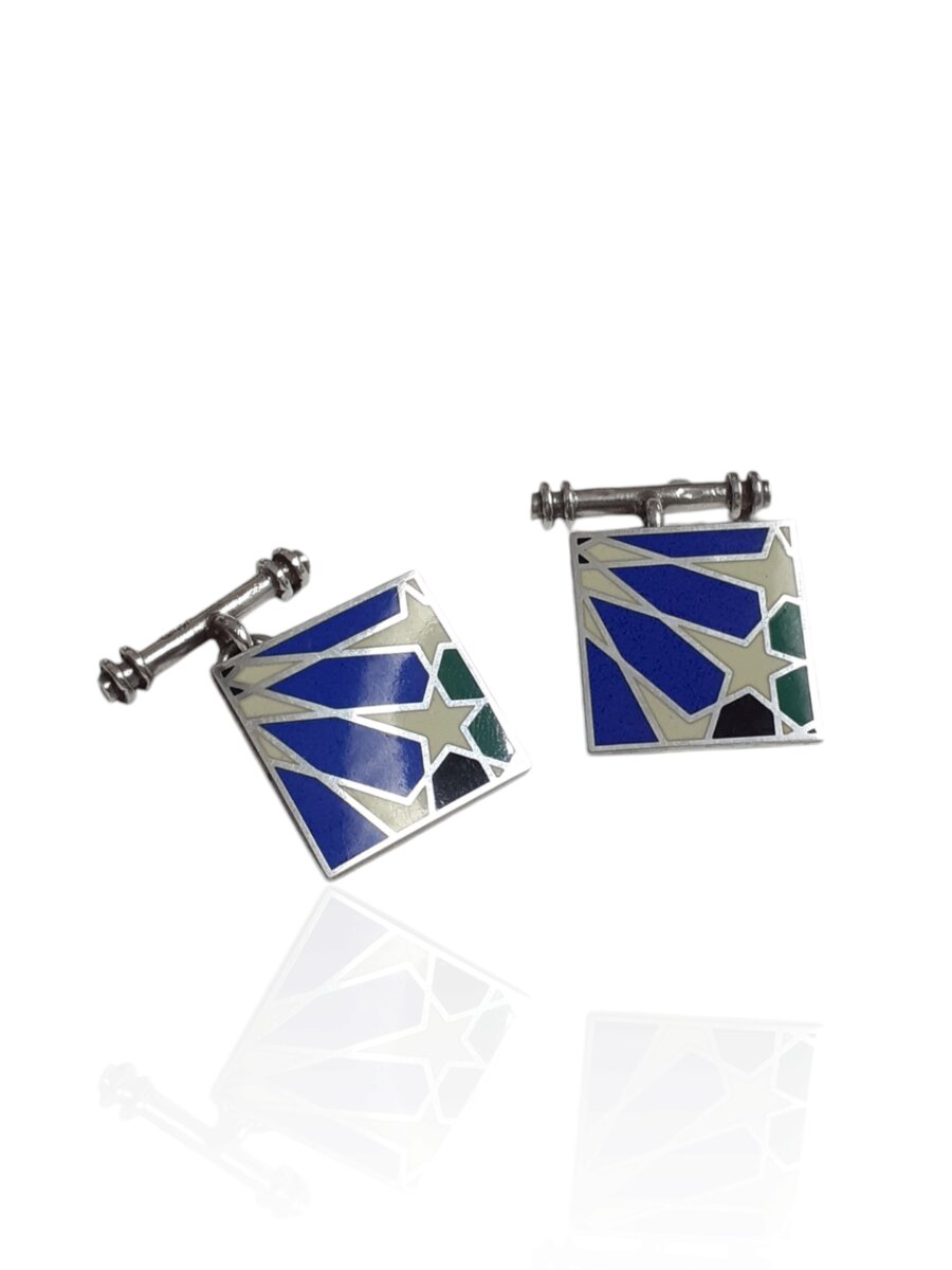Gemelos artesanales en plata y esmalte al fuego, inspirados en los azulejos de la Sala de Lindaraja de la Alhambra. Tradición, diseño geométrico nazarí y elegancia atemporal.