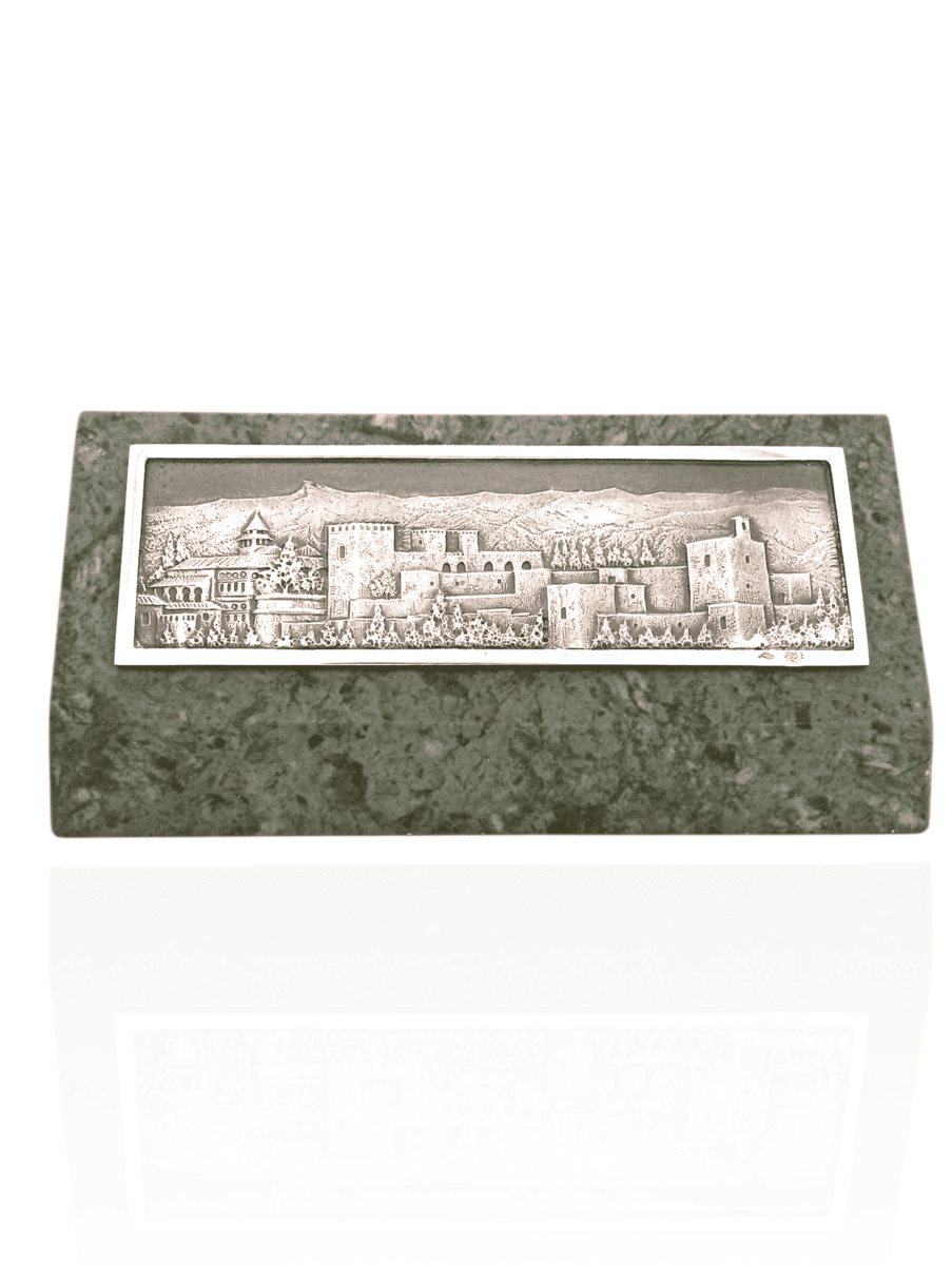Elegante pieza artesanal en plata de ley, que representa la icónica Alhambra con la Sierra Nevada al fondo, capturando la majestuosidad del paisaje granadino en miniatura; se asienta sobre una base de mármol pulido, que aporta estabilidad y un contraste natural con el brillo de la plata. Un objeto decorativo que combina arte, historia y funcionalidad, ideal para escritorio o vitrina.